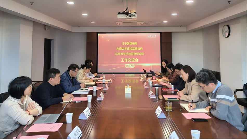 2025年12月8日下午,江宁区信访局局长盛文巍一行到访东南大学,与校纪检监察机构、纪检监察研究院围绕纪检监察与信访工作相关主题开展调研交流。东南大学纪委副书记兼纪检监察机构办公室主任刘静,纪检监察研究院执行院长刘练军教授及双方相关工作人员参会,会议由刘静主持。