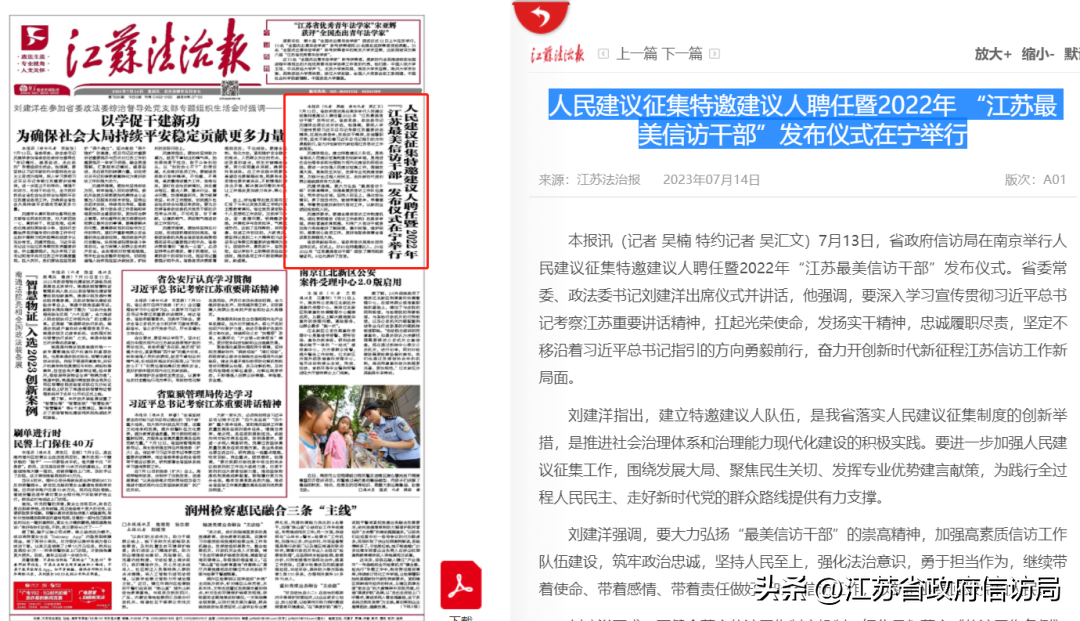 本报讯(记者 吴楠 特约记者 吴汇文)7月13日,省政府信访局在南京举行人民建议征集特邀建议人聘任暨2022年“江苏最美信访干部”发布仪式。省委常委、政法委书记刘建洋出席仪式并讲话,他强调,要深入学习宣传贯彻习近平总书记考察江苏重要讲话精神,扛起光荣使命,发扬实干精神,忠诚履职尽责,坚定不移沿着习近平总书记指引的方向勇毅前行,奋力开创新时代新征程江苏信访工作新局面。