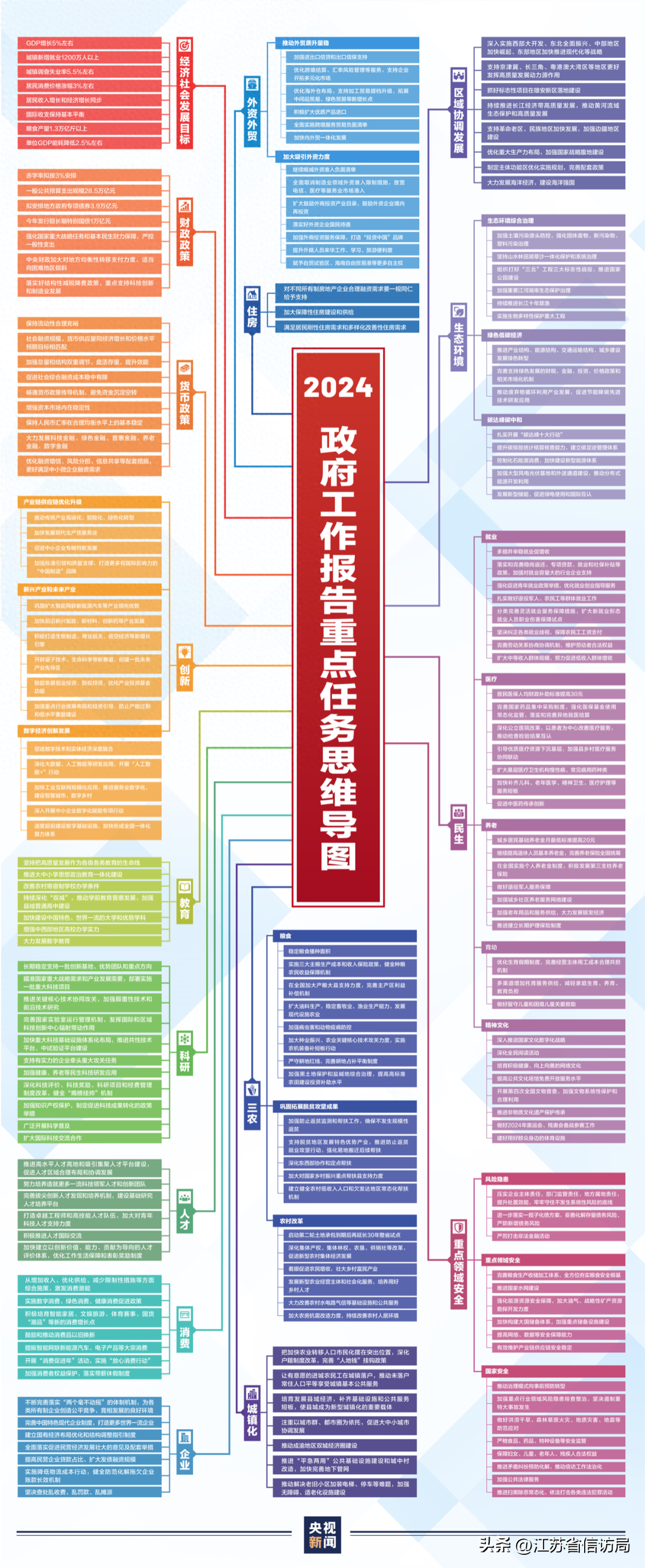 今年政府工作报告,提出了2024年发展主要预期目标和政府工作任务,涉及科技创新、教育、人才培养、消费、住房等多个方面。通过一张思维导图,一起来全面了解↓↓↓